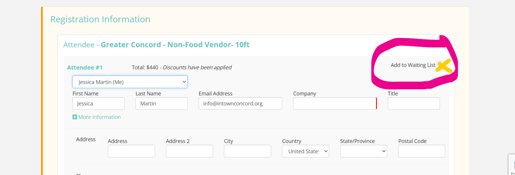 Please refer to the picture below as to how to add yourself when registering. You will only be charged if approved.