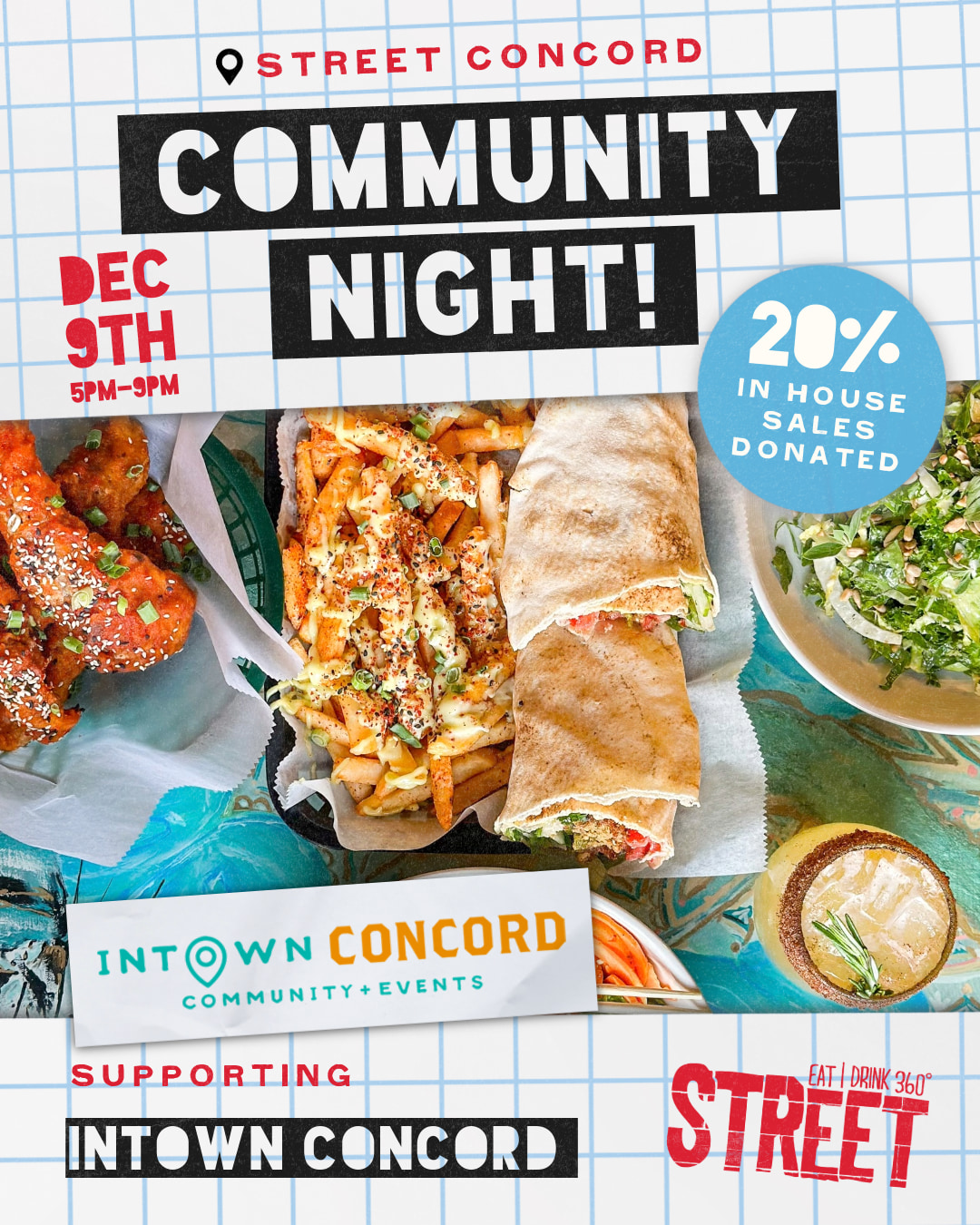 Dine at STREET on Tuesday, December 9 and 20% of your bill will go to benefit Intown Concord. Intown Concord is a 501C3 non-profit with the mission to amplify and celebrate connections in and around downtown Concord. You must mention Intown Concord prior to paying your bill for the donation to take place.