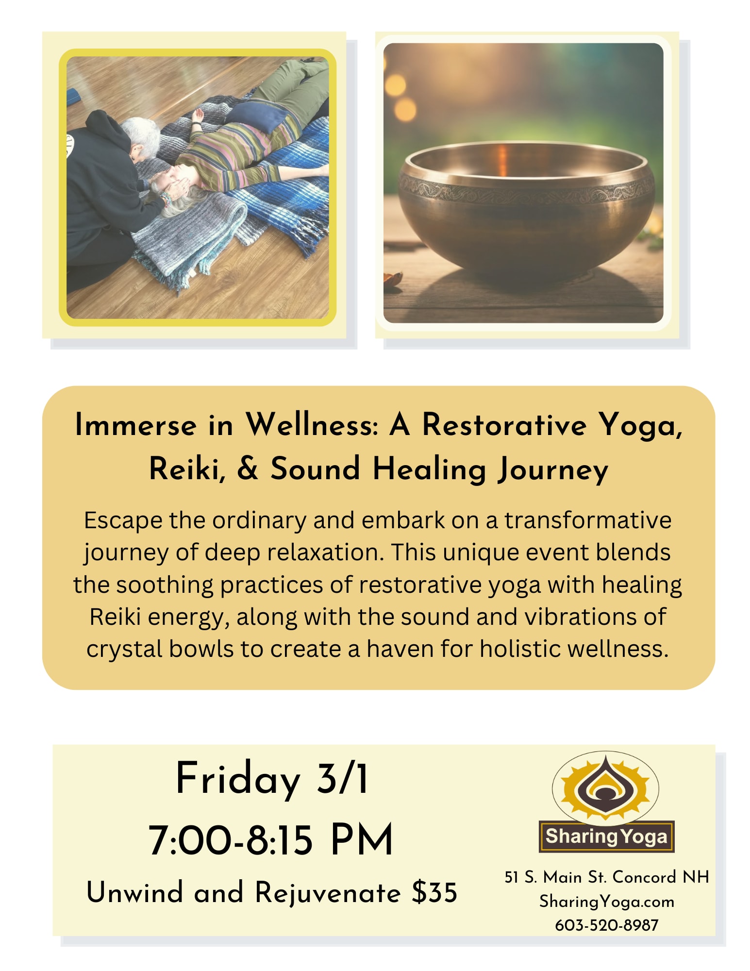 Sharing Yoga (51 S Main St) - (7-8:15 pm) Immerse in Wellness: A Restorative Yoga, Reiki, & Sound Healing Journey $35 Escape the ordinary and embark on a transformative journey of deep relaxation. This unique event blends the soothing practices of restorative yoga with healing Reiki energy, along with the sound and vibrations of crystal bowls to create a haven for holistic wellness.