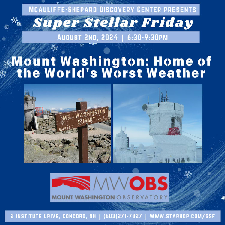 McAuliffe-Shepard Discovery Center (2 Institute Dr.) - Super Stellar Friday - 6:30-9:30 pm. Why is Mt. Washington called the "Home of the World's Worst Weather?" Come learn about the unique life and work of the weather observers stationed on Mt. Washington and why, for a mountain its size, Mt Washington host some of the worst weather on Earth.
