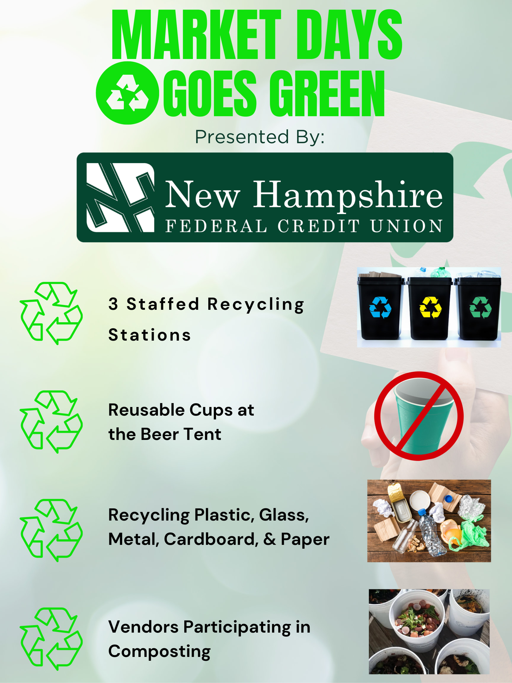 Concord, New Hampshire – June 1, 2023- Intown Concord is thrilled to announce that Market Days, the largest festival in downtown Concord, will be going green this year, thanks to the generous support of our Sustainability Sponsor, New Hampshire Federal Credit Union. With a commitment to reducing our environmental impact, Market Days 2023 will feature various sustainability initiatives aimed at promoting recycling, waste reduction, and eco-conscious practices.